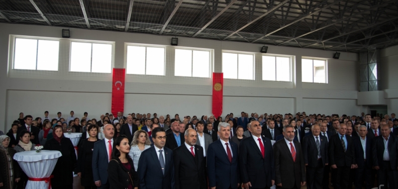 Türkiye'nin Bişkek Büyükelçiliği tarafından Kırgızistan-Türkiye Manas Üniversitesi Cengiz Aytmatov Kampüsü'nde bulunan Bişkek İlkokulu, Ortaokulu ve İmam Hatip Okulu'nun Spor Kompleksi'nde düzenlenen kutlama programı, saygı duruşu ve iki ülke ulusal marşlarının okunmasıyla başladı.