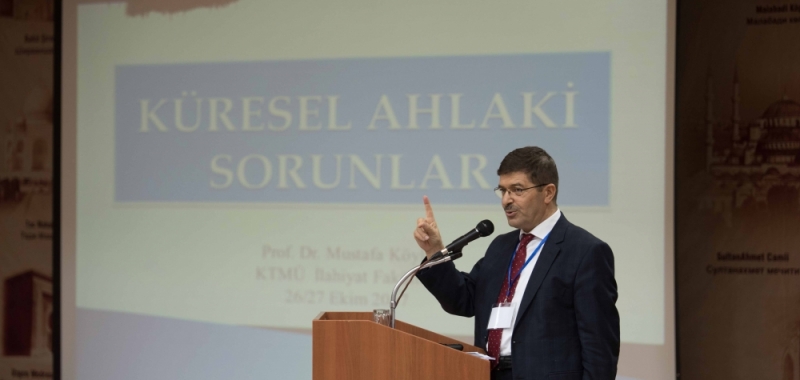 İlahiyat Fakültesi Dekanı Prof. Dr. Mustafa Köylü, etik ve ahlak açısından yoksun kalmış zayıf toplumların ayakta kalabilmesinin mümkün olmadığını söyledi. Prof. Dr. Köylü, “Ahlak ve değerlerle ilgili olarak Epiktetos’un sözlerine değinmek istiyorum: ‘Servet kaybolunca hiçbir şey kaybolmaz. Para kaybolunca bir şey, değerler kaybolunca her şey kaybolur.’ dedi ve sözlerini Yunus Emre’den bir alıntıyla tamamladı: