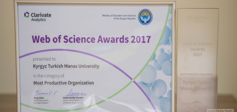 Kırgızistan-Türkiye Manas Üniversitesi (KTMÜ) uluslararası “Clarivate Analytics (Thomson Reuters) University Ranking” ölçütlerine göre 2017’de indeksli dergilerde Kırgızistan’da en fazla yayın yapan ve 1 yıl içinde yayın sayısını 2 kat arttıran yükseköğretim kurumu olarak “Web of Science Awards 2017"de 'en verimli organizasyon' seçildi.