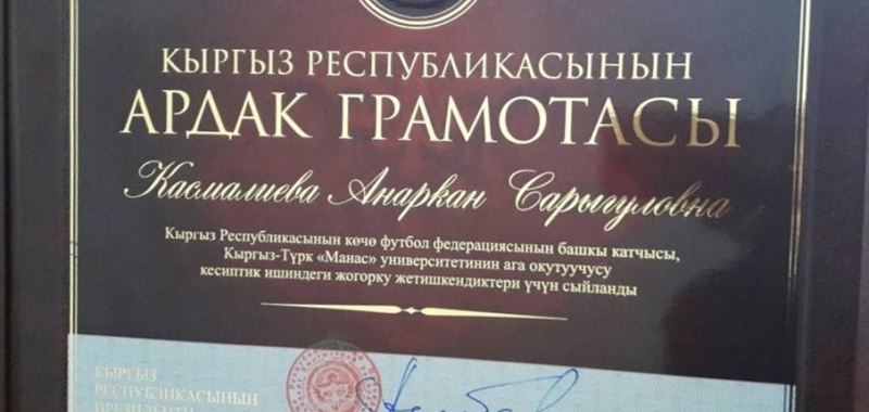 Kırgızistan-Türkiye Manas Üniversitesi (KTMÜ) Öğretim Görevlisi Dr. Anarkan Kasmaliyeva, Kırgız Cumhuriyeti Cumhurbaşkanlığı Onur Belgesi’ne lâyık görüldü.