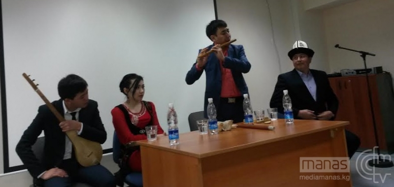 «Баарын коюп Манасты айт» демекчи, алгачкы сөз манасчы Замирбек Баялиновго берилди. Ал кантип манасчылык өнөрдү аркалап калгандыгы тууралуу кыскача маалымат берип: ««Манас» эпосу - бул кыргыз элинин кенчи, улуу мурасы. Манасты баарыбыз билүүгө тийишпиз», - деп, эпостун байыркылыгына, улуулугуна токтолду. Ошондой эле «Манас» эпосунан кыскача үзүндү айтып берди. Андан кийинки коноктор да өз өнөрлөрү жана кыргыздын музыкалык аспаптарынын колдонулушу тууралуу айтып, студенттерди кызыктырган суроолорго да жооп беришти.
