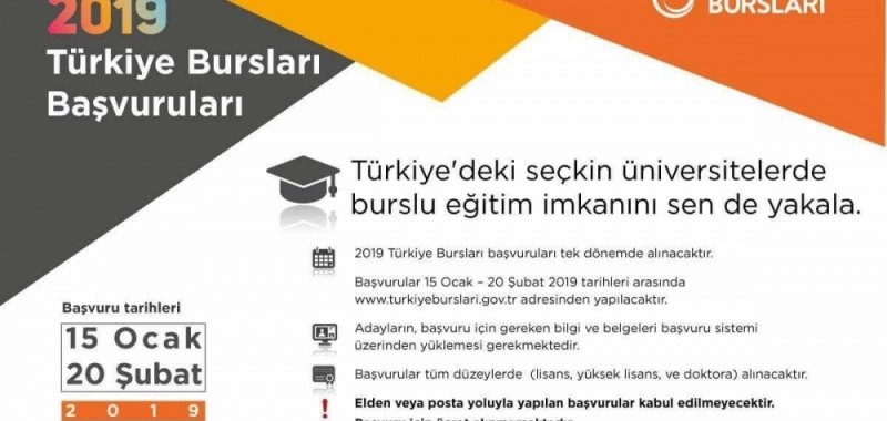 Türkiye Bursları Lisans, Yüksek Lisans ve Doktora programları başvuruları 15 Ocak 2019 tarihinden 20 Şubat 2019 tarihine kadar www.turkiyeburslari.gov.tr internet adresinden yapılacaktır.