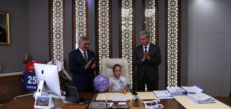 Rektörlükte 22 Nisan 2022’de düzenlenen Programda; Kırgızistan Bişkek Türk İlkokulu öğrencileri Feyza Denizci, Asena Dulkadir ve Zehra Çam, bir 23 Nisan geleneği olarak, Rektör Ceylan ile Rektör Vekili Kulmırzayev’in makam koltuklarına oturdu.