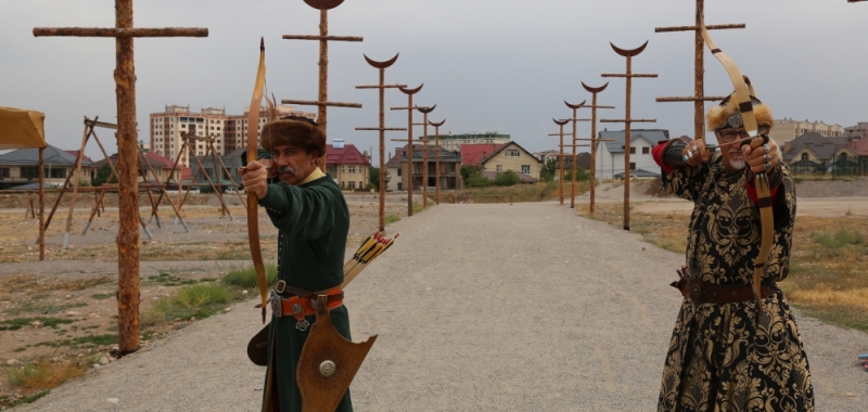 Uluslararası Geleneksel Okçuluk Turnuvası’na katılmak üzere Kırgızistan’a gelen Balıkesir Akıncıları Atlı Okçuluk ve Savaş Sanatları Kulübü Başkanı M. Enis de Turnuva için son hazırlıklarını KTMÜ Geleneksel Sporlar Meydanı'nda sürdürüyor.