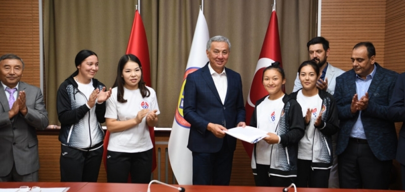 Üniversite bayrağını Manaslı Sporculara takdim eden Rektör Vekili Kulmırzayev, “Sambo takımımızın Üniversitemizi başarıyla temsil edeceğine inanıyorum.” dedi.