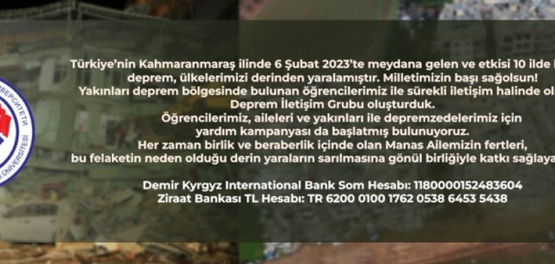 Yardım kampanyasının duyurusunda, “6 Şubat 2023’te merkez üssü Türkiye’nin Kahmaranmaraş ili olan ve etkisi 10 ilde hissedilen deprem, ülkelerimizi derinden yaralamıştır. Milletimizin başı sağolsun! Yakınları deprem bölgesinde olan üniversitemizdeki öğrencilerimiz ile sürekli iletişim halinde olmak için Deprem İletişim Grubu oluşturduk. Bu öğrencilerimiz, aileleri, yakınları ve depremzedelerimiz için yardım kampanyası da başlattık. Her zaman birlik ve beraberlik içinde olan Manas Ailemizin fertleri, bu felaketin neden olduğu derin yaraların sarılmasına gönül birliğiyle katkı sağlayacaktır.” denildi.