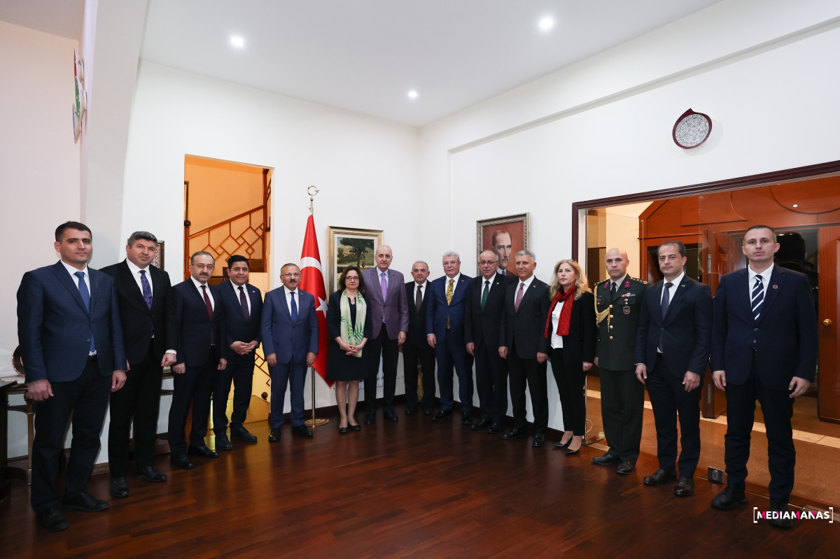 TBMM Başkanı Kurtulmuş ile AK Parti Grup Başkanvekili Muhammet Emin Akbaşoğlu, AK Parti Genel Başkan Yardımcısı ve Ankara Milletvekili Kürşad Zorlu, Yeni Yol Partisi Grup Başkanı Bülent Kaya, Türkiye-Kırgızistan Parlamentolar Arası Dostluk Grubu Başkanı ve AK Parti Tokat Milletvekili Yusuf Beyazıt, MHP Konya Milletvekili Mustafa Kalaycı da Bişkek'e geldi.