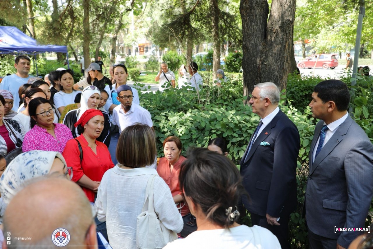 Kırgızistan-Türkiye Manas Üniversitesi Rektörü Prof. Dr. Alpaslan Ceylan ile Rektör Vekili Prof. Dr. Almaz İbrayev, sınav öncesinde salonları gezerek öğrencilere başarılar diledi; dışarıda bekleyen velilerle sohbet ederek onların sorularını cevaplandırdı.