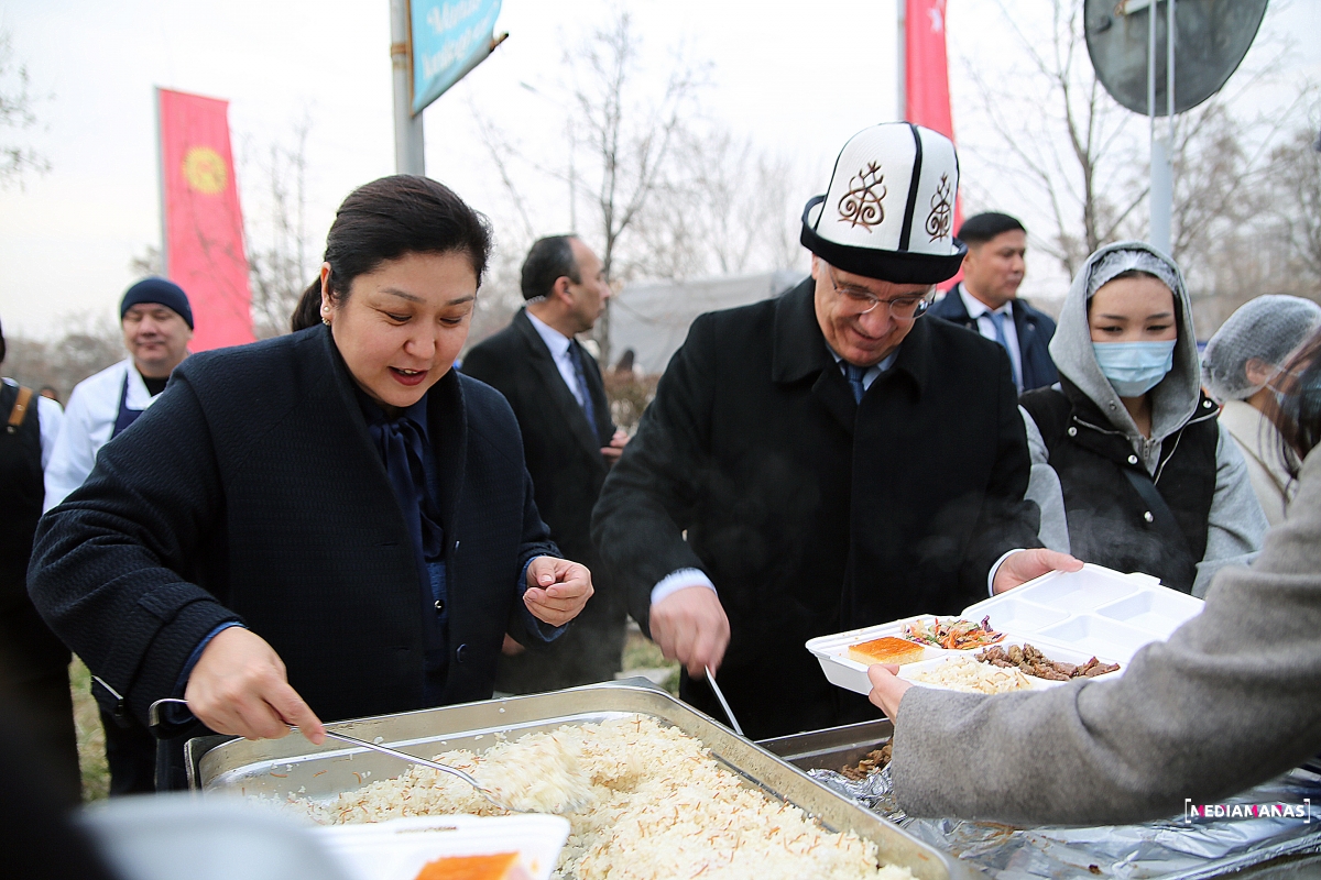Джейлан и Ибраев вместе с министром науки, высшего образования и инноваций Кыргызстана Гулзат Исаматовой и послом Турции в Бишкеке Мекином Мустафой Кемалем Окемом также подошли к месту раздачи еды и лично накладывали блюда участникам.