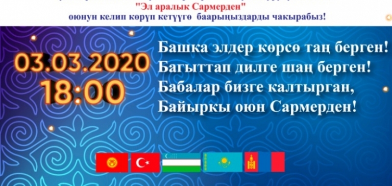 03.03.2020 Кыргыз-Түрк "Манас" университетинде(КТМУ) "Эл аралык Сармерден" оюну болуп өттү. Ага Өзбек, түрк, монгол ж.б улуттардын өкүлдөрү катышты.